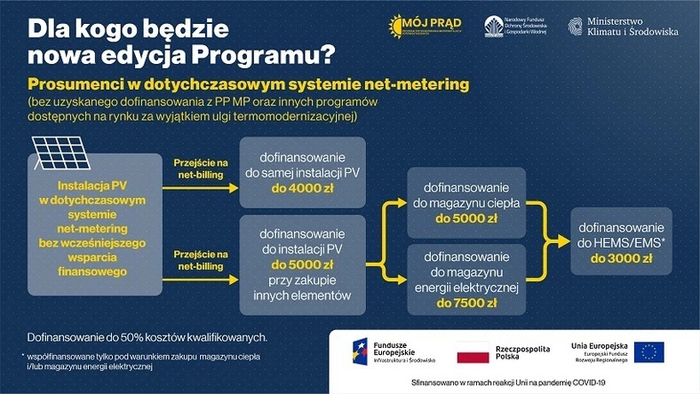 Istnieje jednak również opcja dla obecnych posiadaczy instalacji PV. By jednak otrzymać jakiekolwiek pieniądze, należy zmienić swój obecny system rozliczeń na net-billing. Tutaj mamy jednak dwie sytuacje. Pierwsza dotyczy osób, które korzystały z dofinansowania w poprzedniej edycji programu – w takim przypadku mogą otrzymać do 2 tys. zł dofinansowania fotowoltaiki. Dopłaty do magazynów ciepła i energii oraz systemów HEMS/EMS są dokładnie takie same jak dla nowych instalacji.